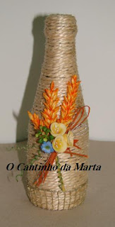 Isto é uma garrafa de água das pedras, que resolvi forrar com corda e depois colocar estes enfeites que fui guardando daqui e dali, reciclando-os. Acho que ficou giro e até pode servir como um belo presente.