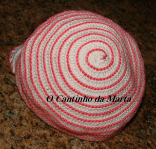 Acabei de fazer este lindo chapéu ou boné, como lhe queiram chamar... Quero um chapéu com pala, quero um chapéu com pala... Até que saiu isto! O que vos parece? Giro ou nem por isso? Como andei (ando) numa de caracóis, resolvi dar-lhe este acabamento em forma de caracol...