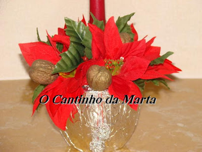Este foi um mini centro de mesa que fiz o ano passado para a mesa de Natal. Como ainda estava tudo bom, decidi montar tudo de novo. Para a realização de um centro de mesa como este, é necessário um pequeno pote, oásis, papel de alumínio, nozes, arame, flores de natal (artificial), azevinho (artificial), vela e uma linha, para pendurar as bolinhas de alumínio. E que tal?