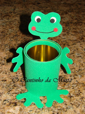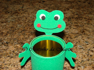 Ao fazer uma pesquisa aqui pela net, deparei-me com este amiguinho e achei que a pequena D ia adorar… Foi super fácil… Lata de salsichas vazia… Dobrar o rebordo para dentro e proteger o mesmo com borracha E.V.A.. Depois foi só passar o esquema para a borracha E.V.A., recortar e colar!