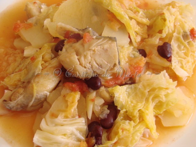bacalhau cortado em pedaços, a couve lombarda, as batatas cortadas em rodelas e