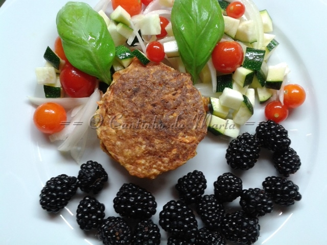 - Salada de curgete, tomates cereja, cebola e folhas de mangericão, temperada com sal, azeite e vinagre;